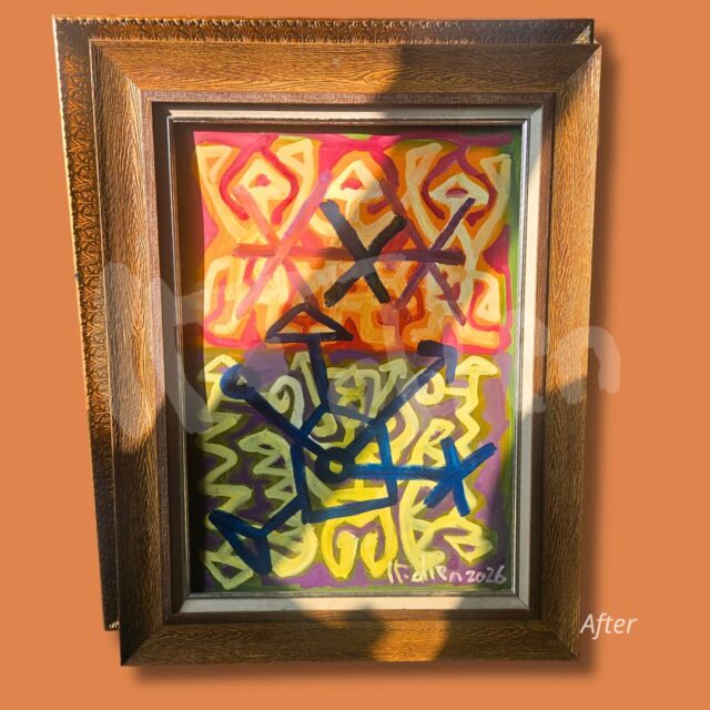 Màu đen trong bức tranh này không đóng vai trò “tô màu” mà đóng vai trò “tuyên ngôn”. Nếu các mảng màu nền (đỏ, cam, vàng, tím) là phần “hồn” – nơi chứa đựng cảm xúc và ký ức – thì những nét đen chính là phần “cốt” (khung xương) giữ cho toàn bộ tác phẩm đứng vững.